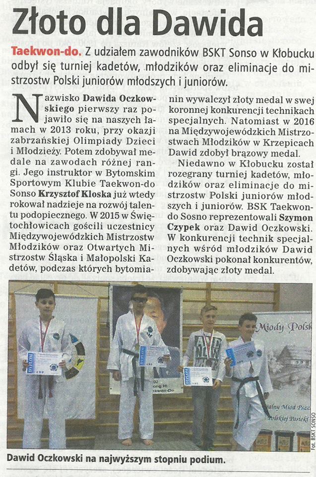 W dniu 19 marca 2017r., w Kłobucku odbył się Taekwon-do Cup turniej skrzatów,kadetów i młodzików oraz I Eliminacje do Mistrzostw Polski Juniorów Młodszych i Juniorów w Taekwon-do ITF. Bytomski Sportowy Klub Taekwon-do ,,Sonso'' reprezentowało dwóch zawodników: Szymon CZYPEK oraz Dawid OCZKOWSKI. W konkurencji technik specjalnych w kategorii młodzik Dawid OCZKOWSKI po raz kolejny nie pozostawił najmniejszych szans swoim rywalom zdobywając złoty medal w swojej sztandarowej konkurencji. Gratulujemy i życzymy dalszych sukcesów!